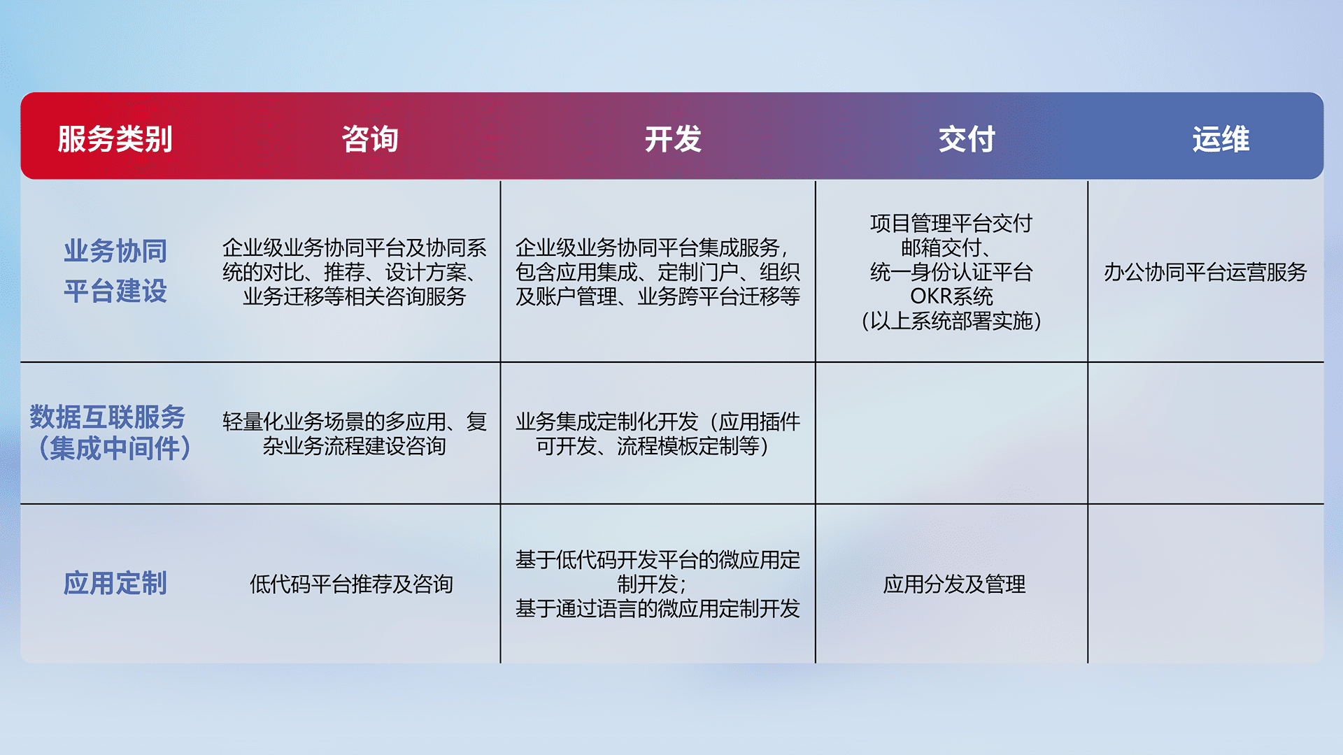 针对钉钉、、企微、、、、IDaas等平台级产品提供产品的规划、、、方案、、、、交付、、定制化开发等服务,,,,实现如统一协同办公、、、、智能客户服务、、、、混合会议管理、、智能数据查询、、、等业务场景,,,,实现数字化转型。。。