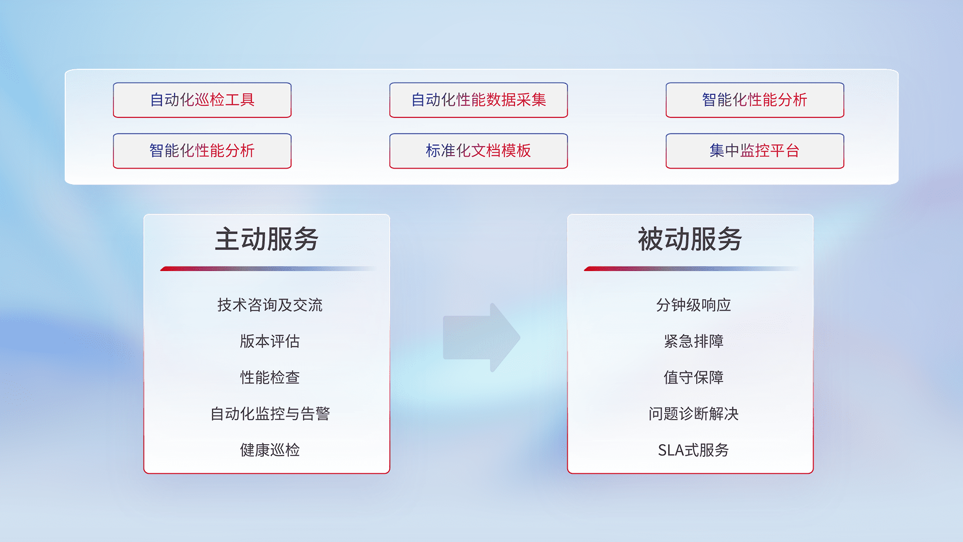 智能化工具和标准化文档,,保障服务质量,,,,提供主动服务(包含技术咨询、、、、版本评估、、性能检查、、、、自动化监控与告警、、、、健康巡检)和被动服务包含(分钟级响应、、紧急排障、、、值守保障、、问题诊断解决、、、、SLA服务)。。。。