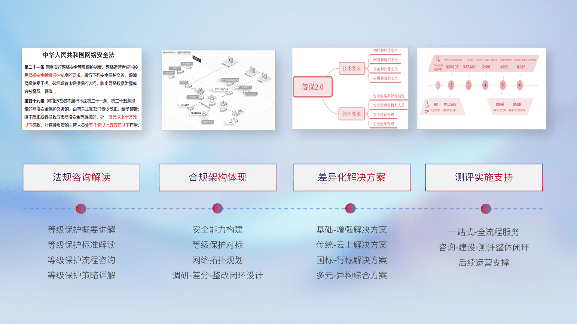 通过专业的法律咨询解读、、、合规架构体现、、、差异化解决方案、、、、测试实施支持等服务,,,,为客户量身打造等保合规体系。。。。